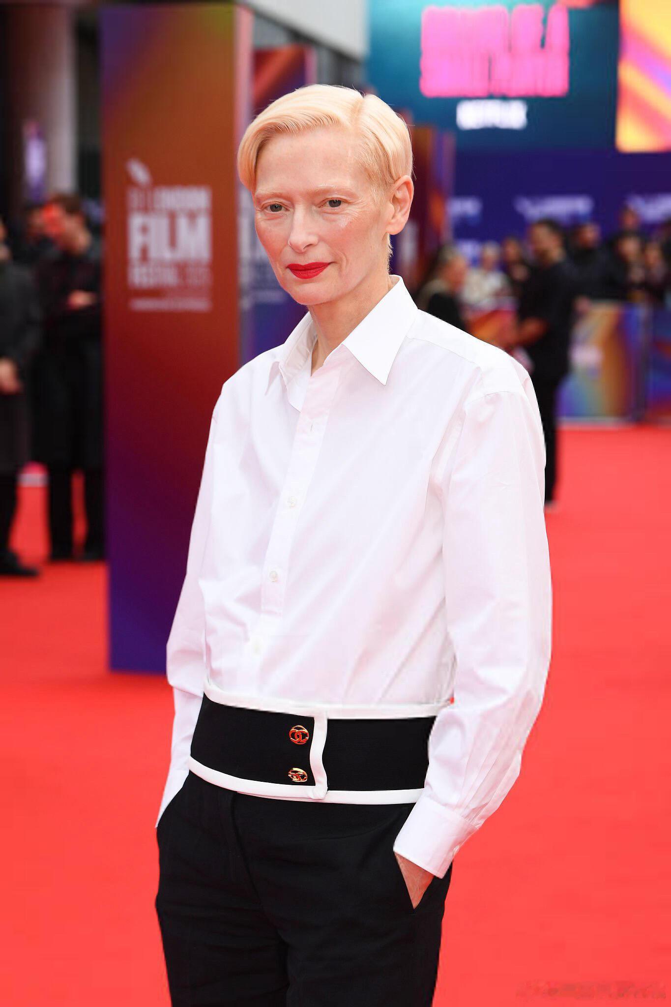 Tilda Swinton上身了前两天刚发布还热乎的Chanel 2026春夏系列,亮相第69届英国电影协会伦敦电影节《小人物之歌》首映红毯。标志的白衬衫和腰封,也是新设计师首秀系列。