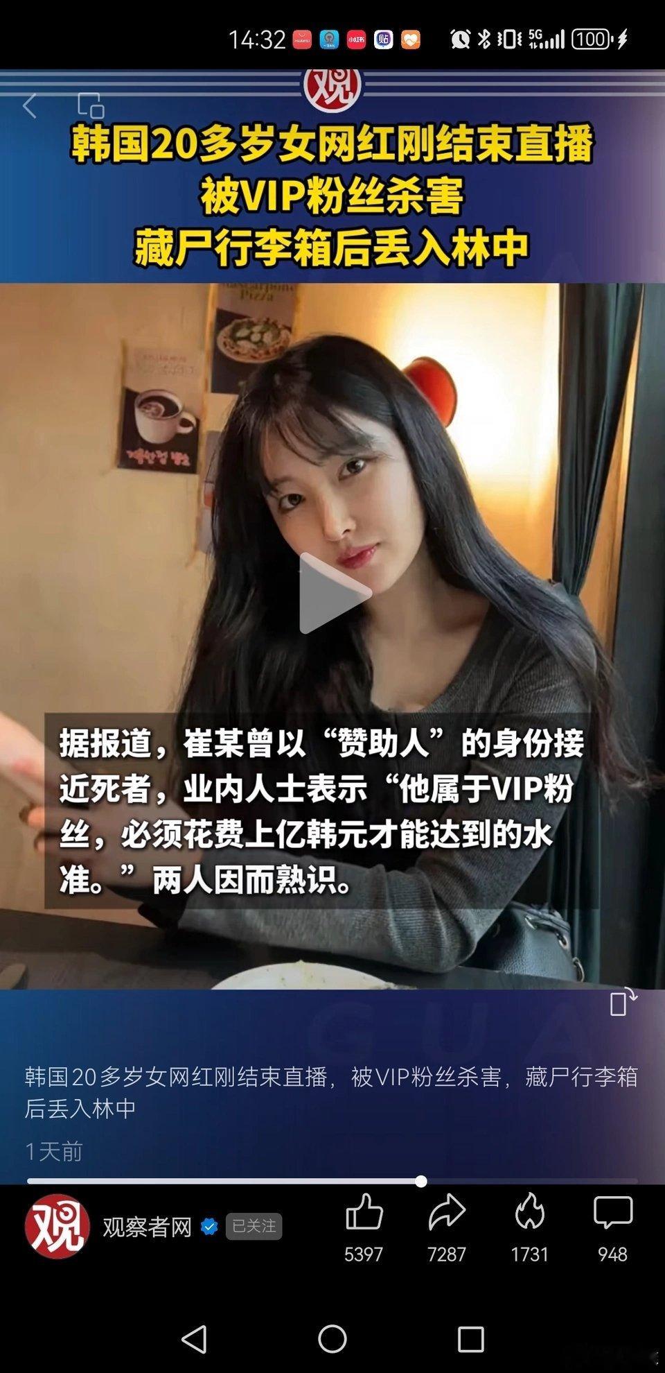 据观察者网,韩国一位20多岁的女网红被榜一大哥残忍杀害。。。