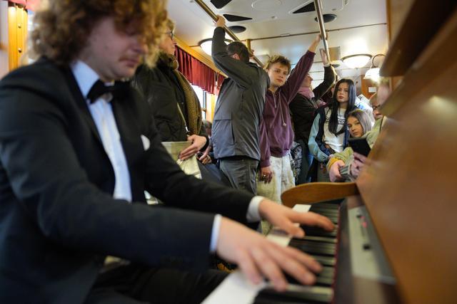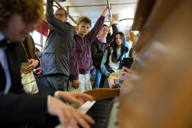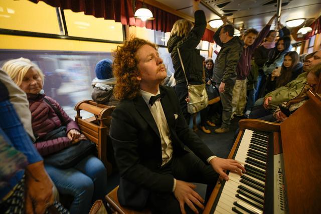 10月9日,在波兰华沙的“肖邦电车”上,一名钢琴家为乘客演奏肖邦作品。新华社发(亚普·阿林摄)