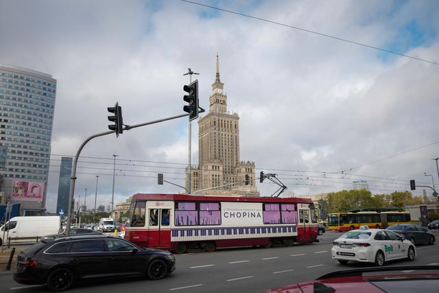 10月9日,一辆“肖邦电车”驶过波兰华沙市中心。新华社发(亚普·阿林摄)