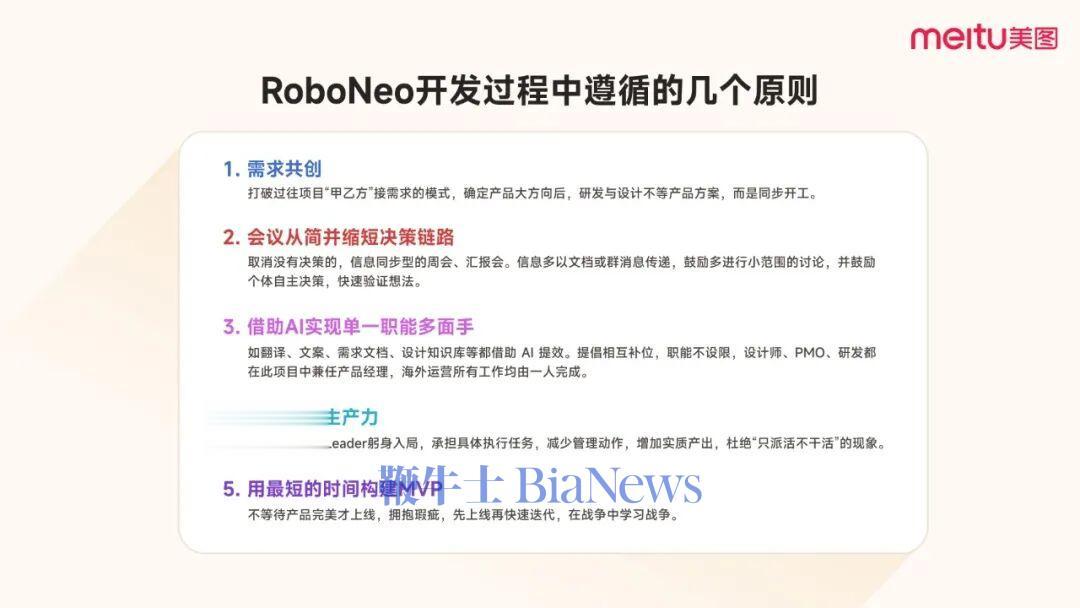 刚刚我用RoboNeo分享了我们做的一些组织创新的尝试。那在AI时代,外面的创业公司又是怎么工作的呢?有个AI创业团队在他们的博客里这样描述自己的工作方式,我简单给大家念一下。