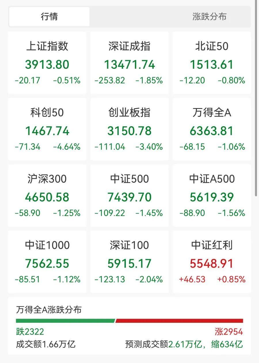 10月10日,三大指数集体低开,截至午盘,上证指数跌0.51%,深证成指跌1.85%,创业板指跌3.4%。市场超2300家个股下跌,成交额1.66万亿,预计成交额上一交易日同期缩量634亿元。