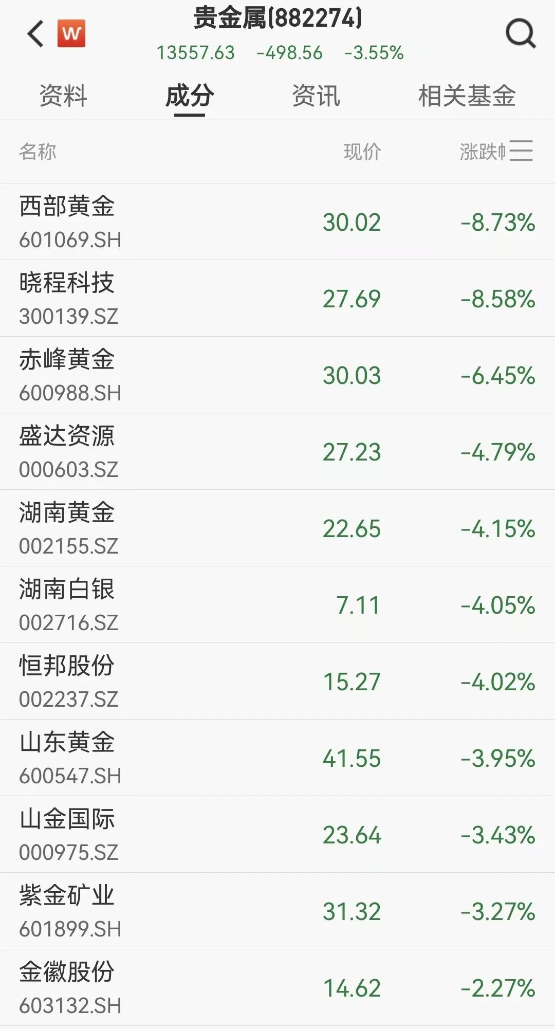 A股贵金属板块大跌超3%,截至午盘,成分股晓程科技、西部黄金跌超8%,赤峰黄金跌超6%。山东黄金、湖南黄金等纷纷下挫。