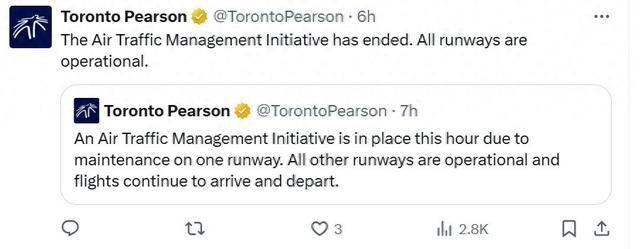 多伦多机场在社交媒体X上发帖称:“空中交通管制措施已结束。所有跑道均已恢复运行。”