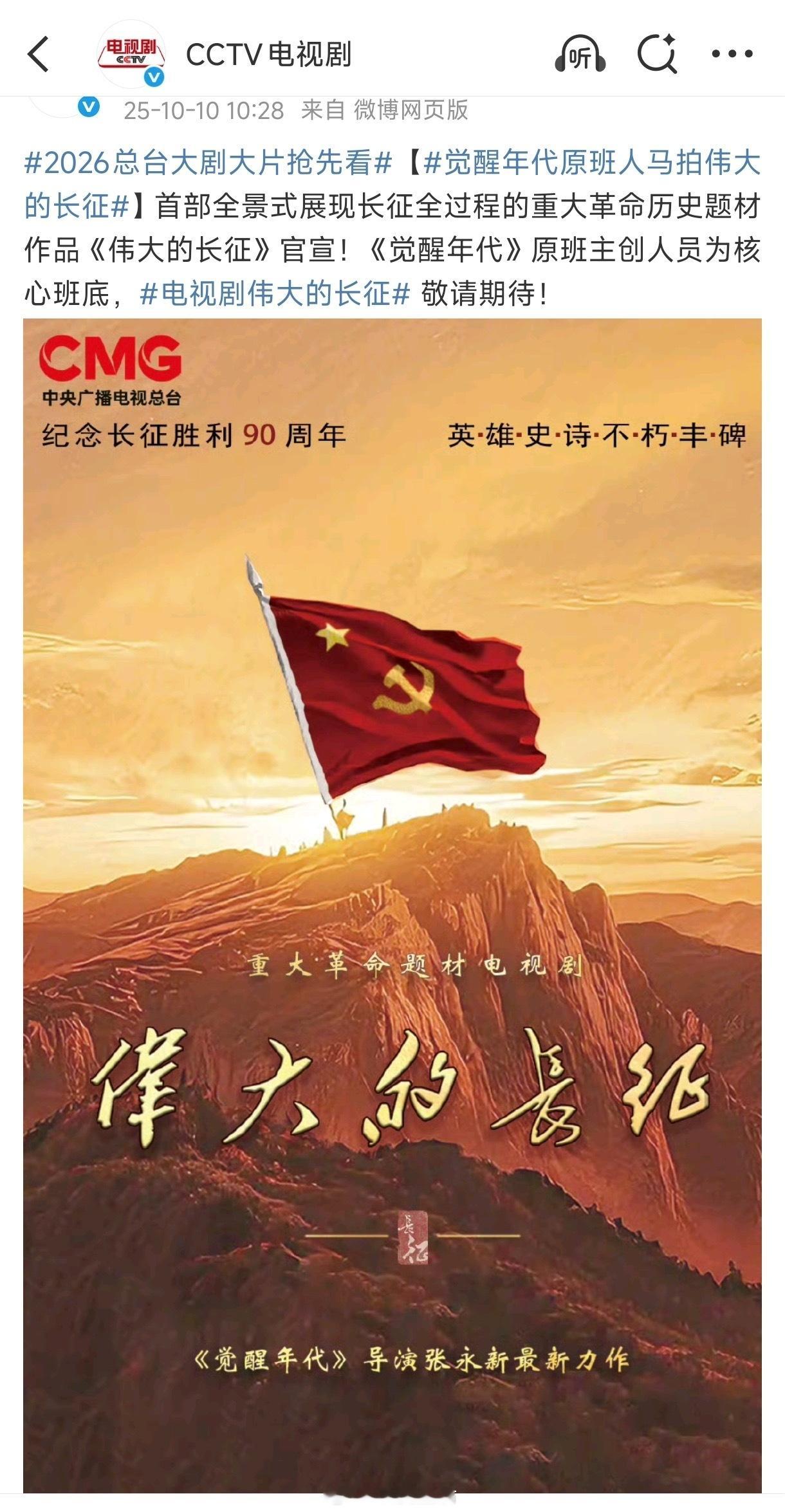 张晚意今天参加央视2026节目的发布会,宣传总台明年的重点大剧《伟大的长征》。这