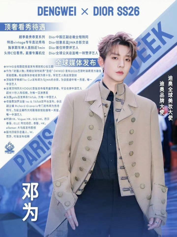 邓为时装周最亮眼艺人top1!!顶奢看秀待遇,全球媒体发布,多项唯一拥有者,完全展现了邓为的时尚表现力与影响力,生而不凡,注定闪耀[哇]