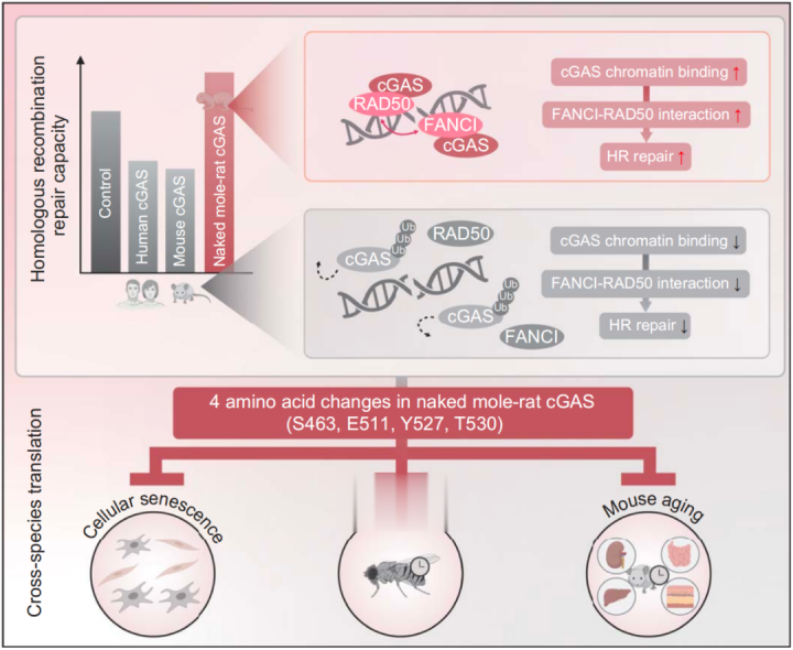 从机制上来说,cGAS上的这种氨基酸的改变,使裸鼹鼠的cGAS能够通过调控其泛素化状态,延长其在DNA损伤后的染色质上的保留时间,从而改变其与分离酶P97的相互作用。裸鼹鼠cGAS在染色质上的延长存在促进了经典同源重组因子RAD50与主要与范可尼贫血途径相关的FANCI之间的复合物形成。研究团队进一步证明,FANCI促进了RAD50在染色质上的募集,从而增强了同源重组修复。因此,裸鼹鼠的cGAS减轻了应激诱导的细胞衰老,缓解了器官退化,并延长了果蝇的寿命。关键的是,恢复这4个氨基酸改变则消除了这些保护作用。