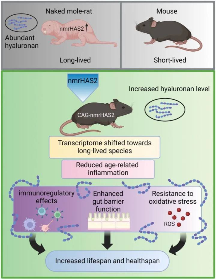 该研究将裸鼹鼠透明质酸合成酶2基因(nmrHAS2)转基因到小鼠中,从而改善了小鼠的健康状况,并延长了其寿命和健康寿命。这项开创性工作首次证明了裸鼹鼠的长寿与抗癌机制可以被转化到其他短寿物种中。