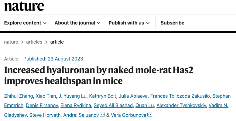 2023年8月23日,美国罗切斯特大学VeraGorbunova和AndreiSeluanov团队(张智辉为第一作者)在Nature期刊发表了题为:Increasedhyaluronanbynakedmole-ratHAS2improveshealthspaninmice的研究论文[2]。