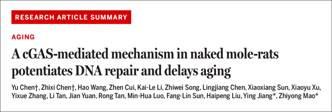 2025年10月9日,同济大学生命科学与技术学院/附属妇产科医院毛志勇教授、蒋颖副教授作为共同通讯作者(陈御、陈芷茜为共同第一作者),在国际顶尖学术期刊Science上发表题为:AcGAS-mediatedmechanisminnakedmole-ratspotentiatesDNArepairanddelaysaging的研究论文[1]。