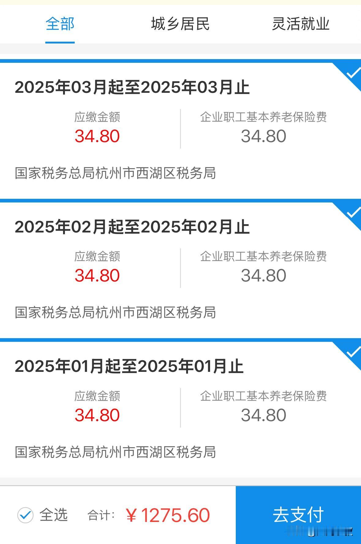 “真涨了” 这是杭州的灵活就业养老社保,今天刚打开交了,由原来的962变成了997,每个月多了35,另外要补上前边8个月的,一共1275.6。 真不明白为什么年年涨,本来是保障,现在直接成了负担了,最少20年,把人捆住。 我有个朋友,40了没交过,我让她交,哪怕交个居民养老,她说她身边的朋友都没有交的,还有的退了,说领不到,让我不要太在意这个。 可我真做不到那么心大,我可不想老了给孩子添负担,所以还得省吃俭用坚持交,就当养了个孩子吧,到时我领到了,还能帮帮孩子,谁知道以后她们长大了好不好混。哪怕以后只能领到2000多,我们也至少有口饭吃。 过几天父母的医保应该也要交了,俩人1000多,得把这笔钱再留出来。孩子的应该也快了,300多,天天数着钱过日子啊。 灵活社保 浙江社保养老金 浙江社保