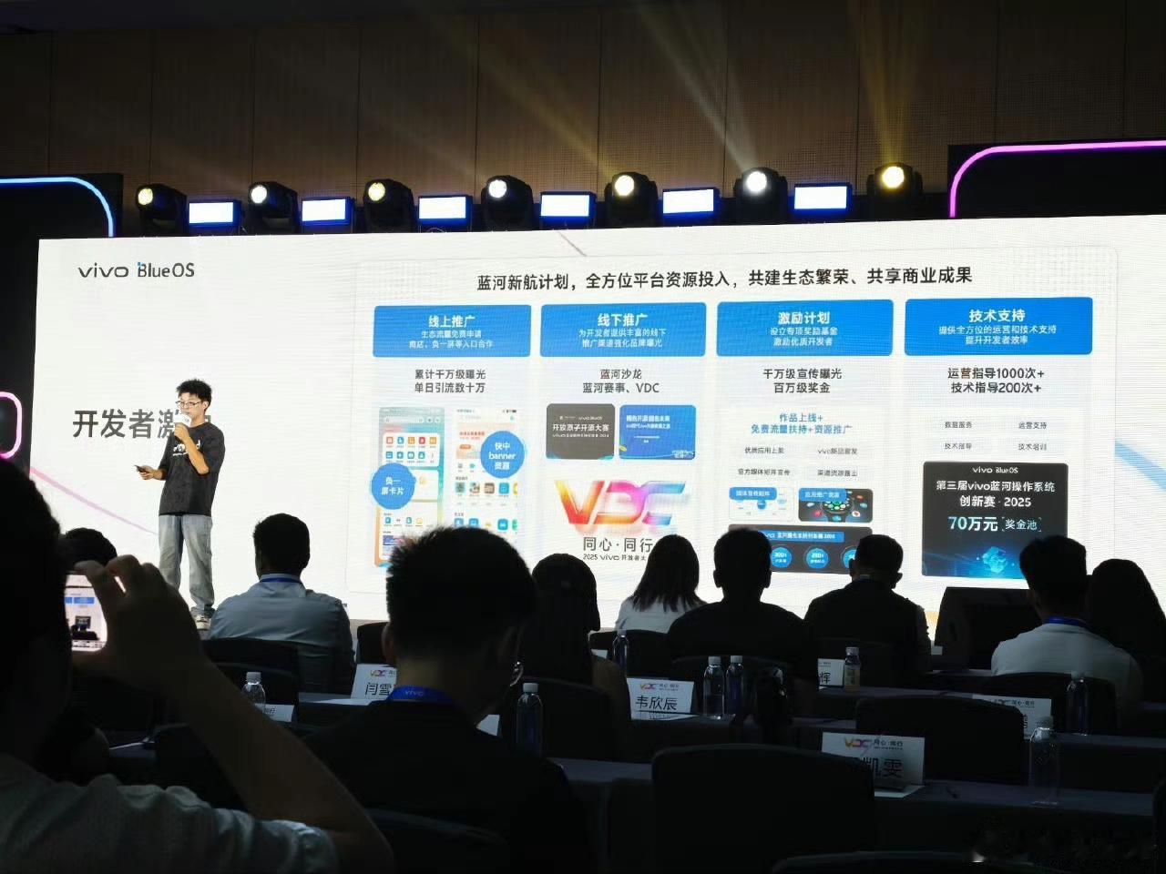 打卡 2025 vivo 开发者大会 蓝河操作系统分会场 【蓝河操作系统是干啥的?】 vivo蓝河操作系统负责人杨春:未来AGI时代,vivo也要成为引领者。以3年为限,蓝河操作系统将成为下一代AI原生设备的操作系统。 比如眼镜、机器人、MR混合显示头显、耳机等。 【蓝河操作系统优势是?】 天生安全,天生流畅,天生低能耗长续航,内核开源,已经申请加入开放原子开源基金会进行项目孵化。 对于开发者而言,带来丰富的流量入口,一次开发多端部署,支持智能体一键发布(以快应用为载体),蓝河开发套件持续完善。 【蓝河操作系统的能力?】 影像:高集成,轻量化,低功耗,AI能力加持。(看完这个,感觉vivo做类似于大疆Pocket3这类产品,应该会更强大。) 多媒体:可以带来强大的视听体验,这块手机厂商经验丰富。 AI:蓝心大模型矩阵,蓝河Agent框架。 低功耗。 连接:高可靠性的跨终端连接。 【蓝河流畅引擎】 高性能实现,超级协程,超级渲染树,多媒体引擎等。 蓝河操作系统,可以作为前沿实验田打造新技术赋能OriginOS,可以为未来AI原生设备提供服务,就比如vivo的智能手表,便是搭载了该系统,最新的vivo Watch GT2凭借蓝河操作系统3.0,带来了33天的长续航,且功能更加丰富「流畅丝滑的操作体验;蓝心小v/小v建议升级,支持连续对话与更强的理解能力;支持手机碰一碰传图AI生成表盘,iPhone vivo双机互联后实现手表通知同步;支持更丰富的三方应用。」 总之,蓝河操作系统对于vivo意义非凡,承载着蓝厂巨大的梦想。