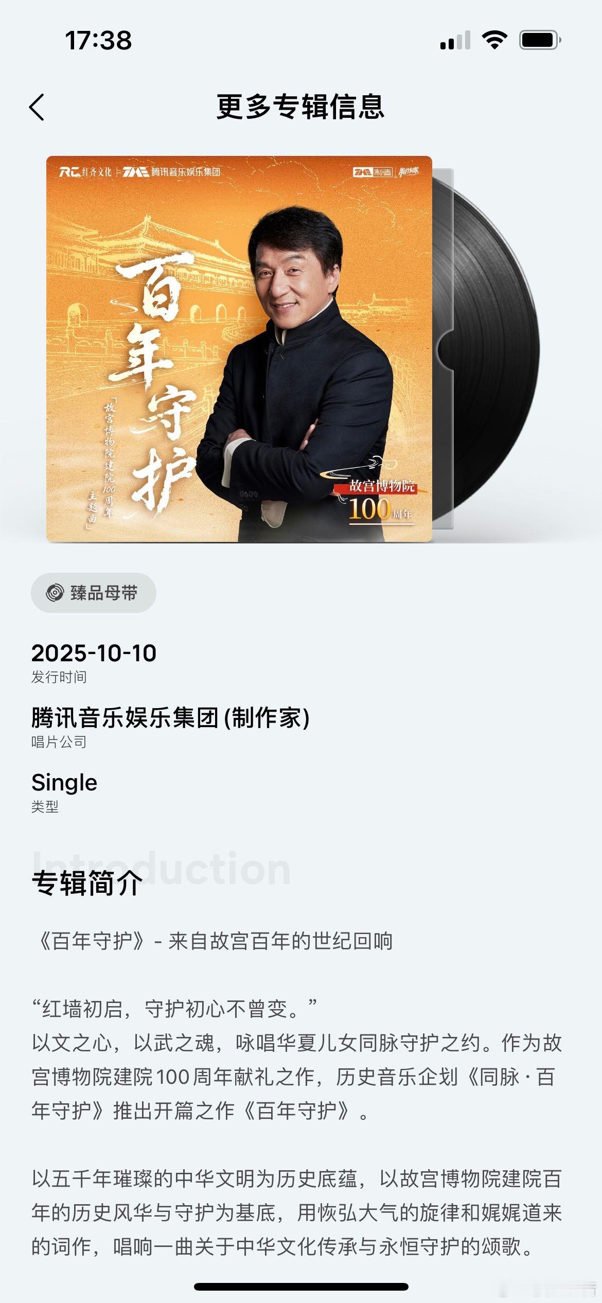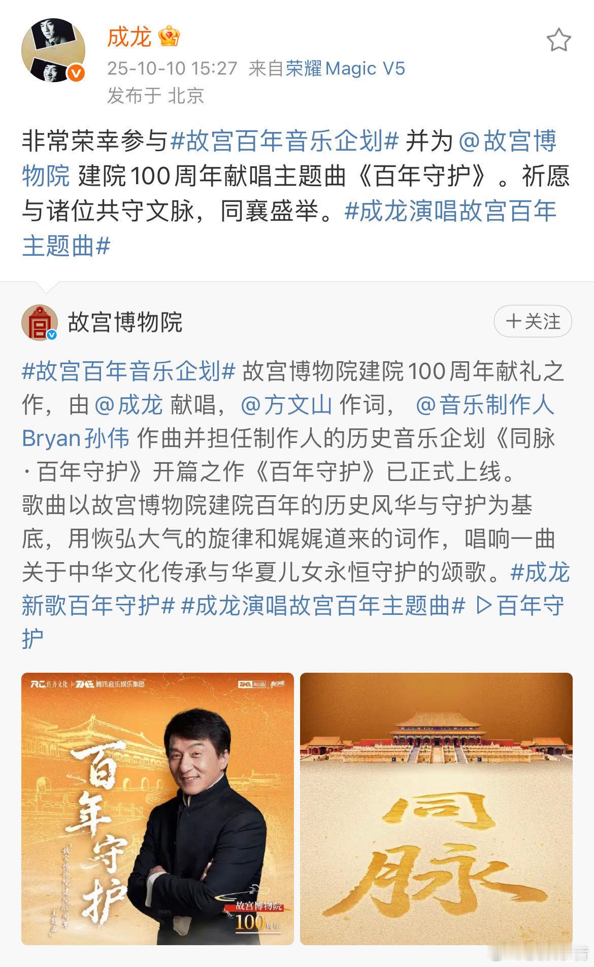 成龙演唱故宫百年主题曲 一份献给故宫百年的音乐礼物已送达。由演唱, 作词,TME制作人联盟成员作曲并担任制作人的故宫百年主题曲《百年守护》今日在QQ音乐、酷狗音乐、酷我音乐同步上线。作为历史音乐企划《同脉·百年守护》的开篇,它用温暖的旋律与歌词,将紫禁城的守护故事与民族同脉的承诺,诚挚献予每一位听众。
