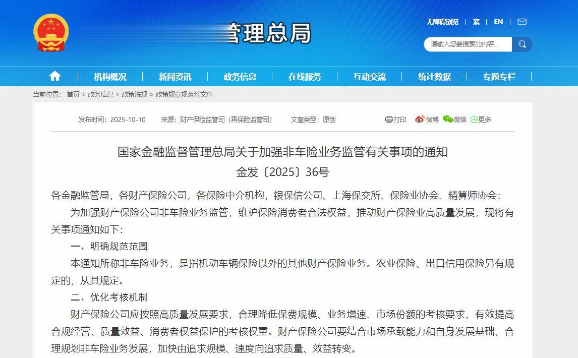 国家金融监督管理总局10月10日对外发布《关于加强非车险业务监管有关事项的通知》。