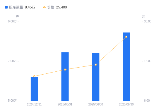 日期A股户数(户)流通A股户均持股数(股)户均持股市值(万元)2025-09-30844898137.0320.672025-06-30741329273.8615.712025-03-31745188958.9913.852024-12-31619529591.8412.882024-09-304487910849.0112.942024-06-304417611024.509.052024-05-104404511057.2911.802024-03-314367611150.9210.262024-01-104627510524.6210.512023-12-314649210475.5011.09