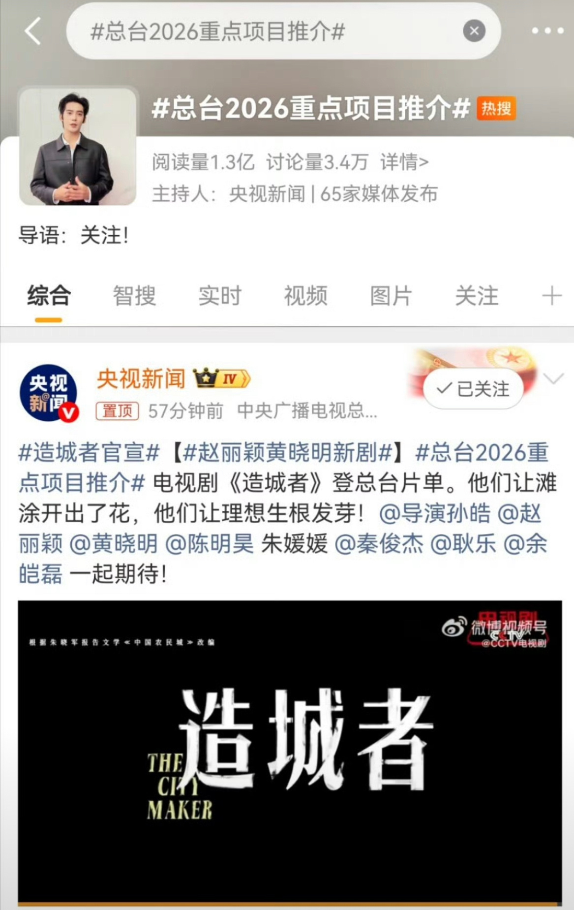 接着央视把赵丽颖主演造城者作为总台重点项目置顶了