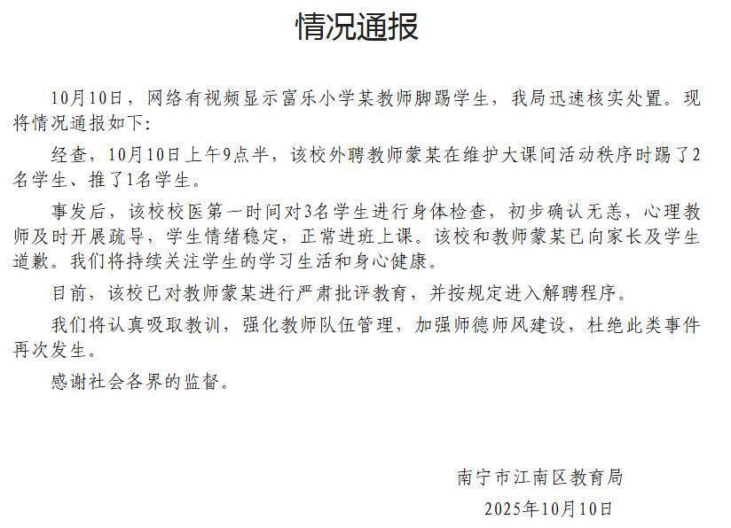 10月10日,网络有视频显示广西南宁江南区富乐小学某教师脚踢学生,南宁市江南区就该事件进行情况通报: