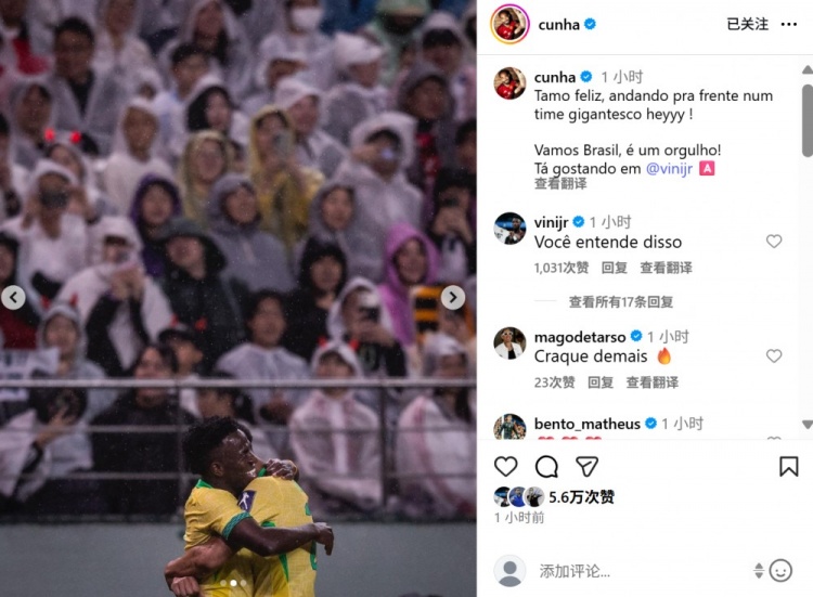 赛后库尼亚也在社媒晒出与维尼修斯庆祝进球的合照,配文写道:“我们非常高兴能与这支伟大的球队继续前进,加油巴西队,我们为你骄傲。与维尼修斯连线破门!”