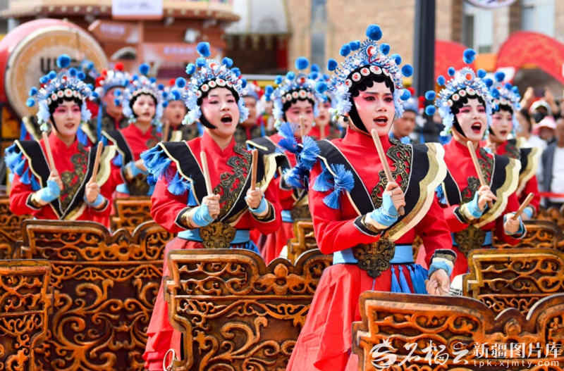 10月1日,“忠勇杨家鼓”表演在乌鲁木齐大巴扎步行街震撼上演。石榴云/新疆日报记者汤永摄