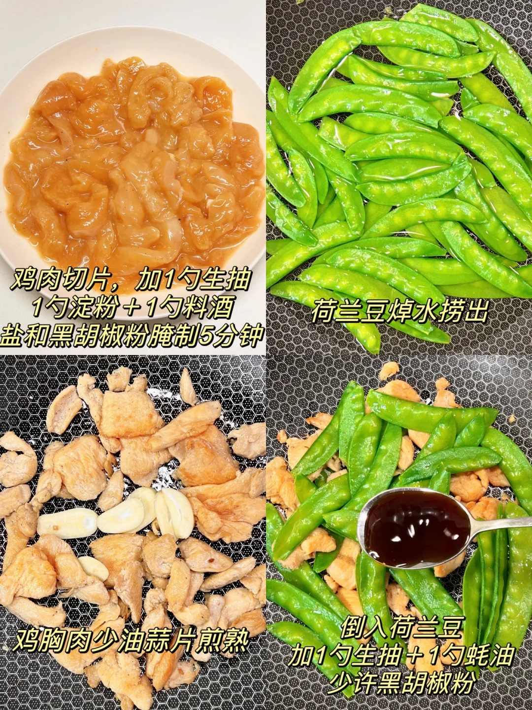 鸡胸肉切片,加料汁腌制一下,荷兰豆焯一下水,炒起来熟的快!