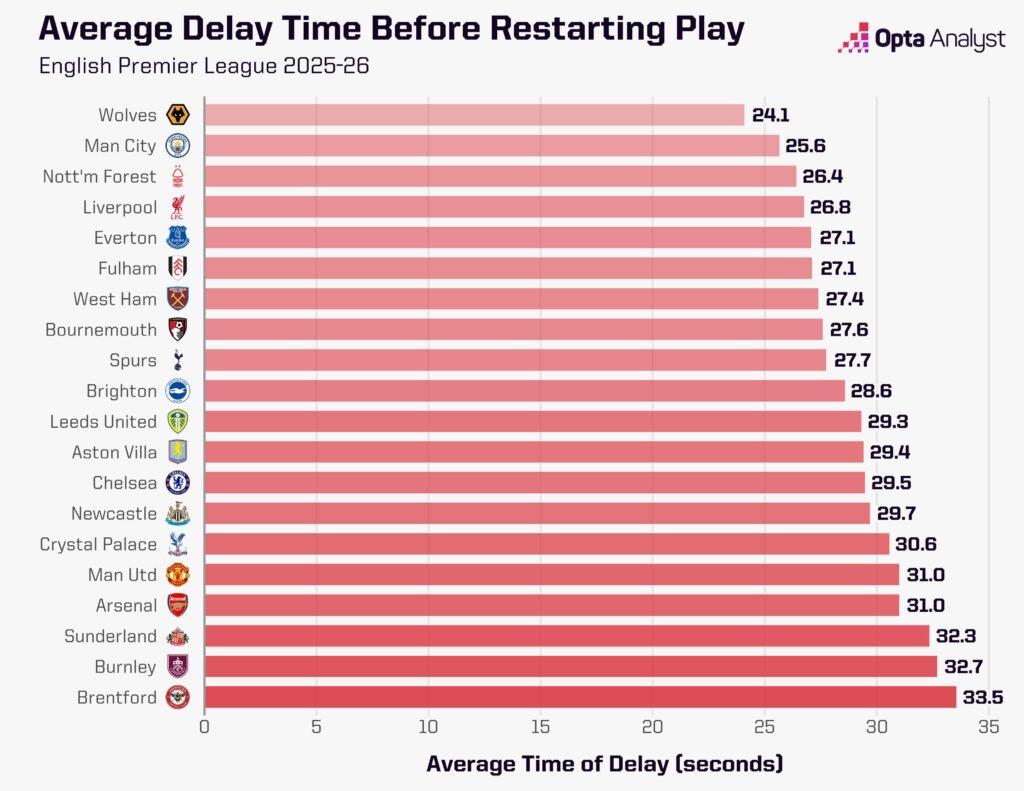 布伦特福德是最慢的球队,他们平均需要33.5秒才能让比赛重新开始。紧随其后的是两支升班马伯恩利(32.7秒)和桑德兰(32.3秒)。不过值得注意的是,两大传统豪门阿森纳与曼联的节奏也并不快,平均用时同为31秒。