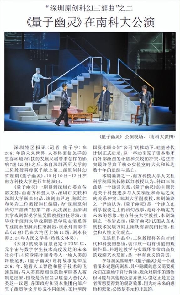 《量子幽灵》一剧得到深圳市委宣传部支持,由南方科技大学、深圳市文联和深圳大学联合出品。该剧由尹迪、陈跃红和吴岩三位教授担任编剧,为“深圳原创科幻三部曲”的第二部。此次演出由深圳大学戏剧影视学院吴熙教授担任导演,由毕业于深圳大学戏剧影视学院表演系等专业院系的演员担纲演出。该系列首部作品《云身》已在大湾区上演11场,剧本获得2024年人民文学奖(特殊文体奖)。