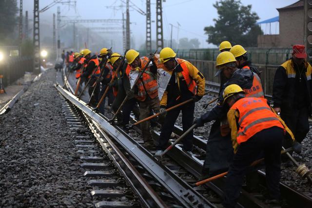 10月10日,铁路职工在陇海铁路甘肃省榆中县境内冒雨进行集中修施工作业。新华社发(王克贤摄)