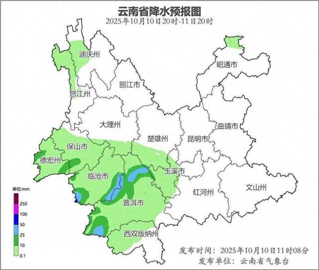 10月10日,云南在副热带高压外围偏西气流的影响下,临沧市南部、普洱市西部和北部仍有小到中雨局部大雨、暴雨;明天,普洱市西部和北部有小到中雨局部大雨。