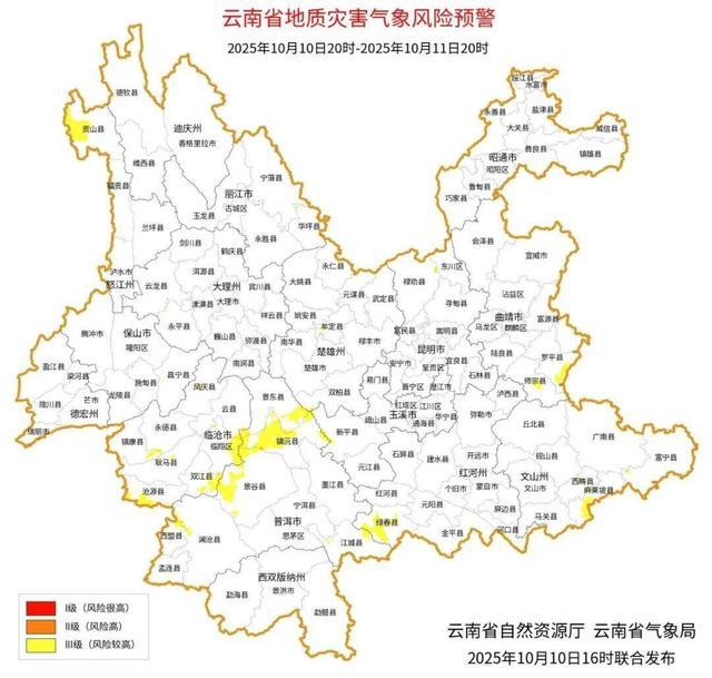 预计,2025年10月10日20:00~10月11日20:00,临沧市沧源县,普洱市景谷县、镇沅县发生滑坡泥石流的风险高;昆明市北部,曲靖市南部,红河州西南部,文山州南部,普洱市北部和西部、东南部,怒江州北部,临沧市北部、东部和南部发生滑坡泥石流的风险较高。