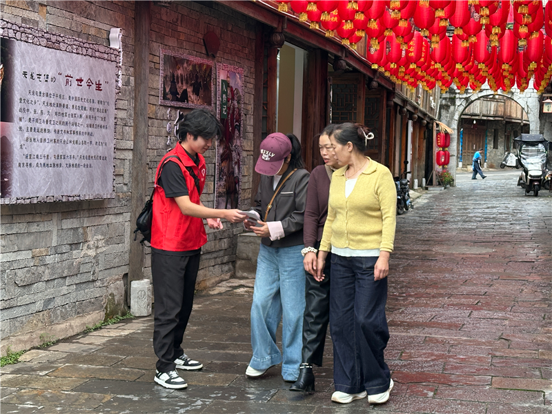 节日期间,从黄果树大瀑布,到历史悠久的天龙屯堡,再到花江峡谷大桥等新兴景点,各景区服务站点随处可见志愿者们忙碌的身影。他们身着统一服装,不仅为游客提供线路咨询、秩序引导、应急帮助等基础服务,在共青团安顺市委的有序组织下,更将志愿服务升级为“文化体验”的一部分。志愿者们创新采用“文化讲解+精准帮扶”的服务模式,深入挖掘安顺本地历史文化,将地戏表演、古建筑故事等非物质文化遗产元素融入导览讲解,让游客在观赏山水之余,沉浸式感受安顺深厚的文化底蕴和人文魅力,志愿者们还化身“活地图”和“贴心人”,为八方游客提供线路规划、景点介绍、秩序引导、应急协助和创意拍照等多样化便民服务。