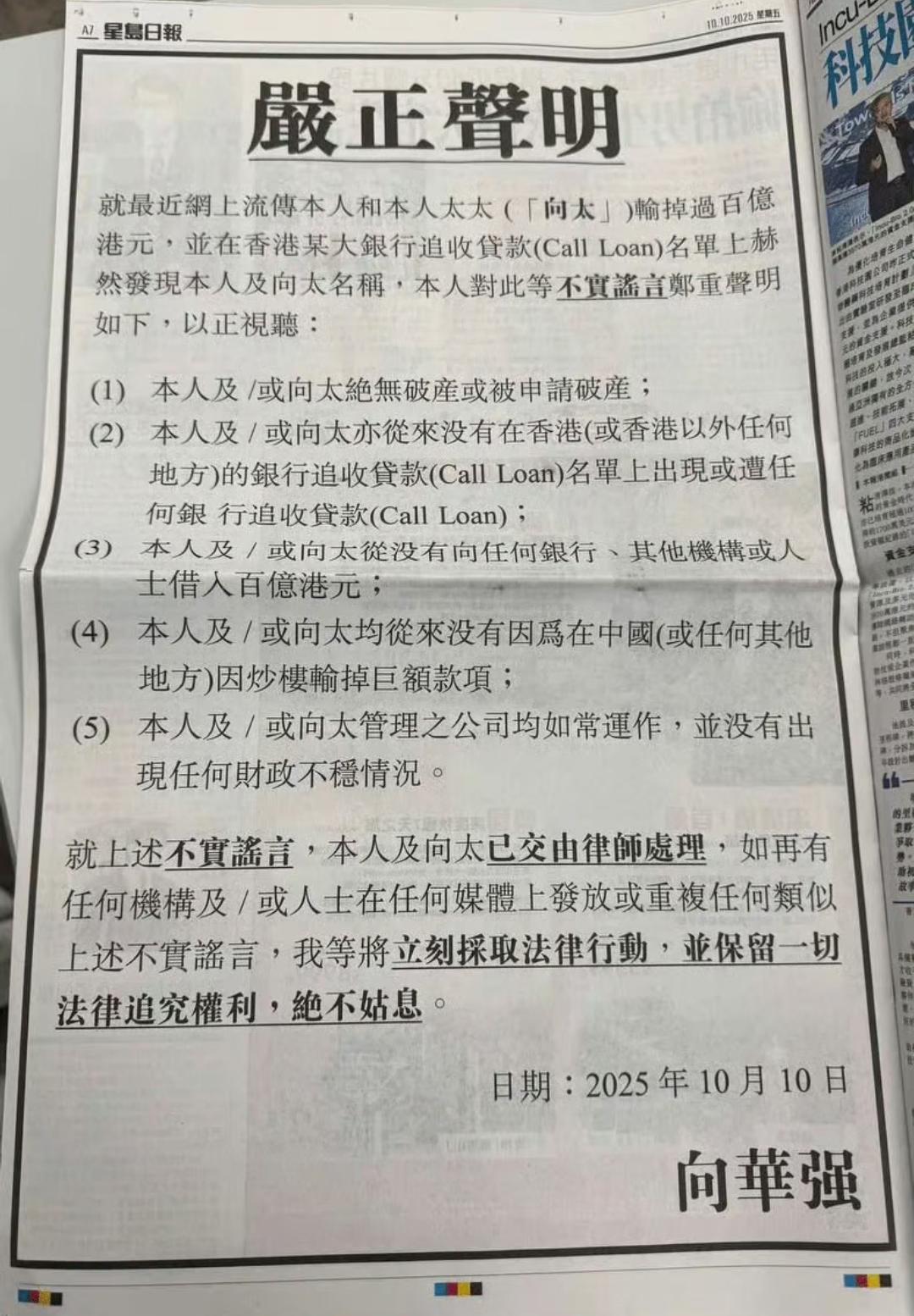 向华强生气了,登报辟谣:网传百亿债务、破产都是假的,这些造谣者也是碰上好时候了,要是放在以前强哥可能直接下江湖追杀令了。 最近网上传向华强和向太欠了百亿、还被银行追债甚至要破产?10月10日向华强直接在登报发声明,把这些谣言全给否了! 声明里说,他俩既没破产,也没在银行追贷名单里,更没借过百亿,炒楼输钱也是瞎编的,公司运营得好好的。还放话已经交给律师处理了,谁再传这些假消息,直接法律伺候,绝不手软!