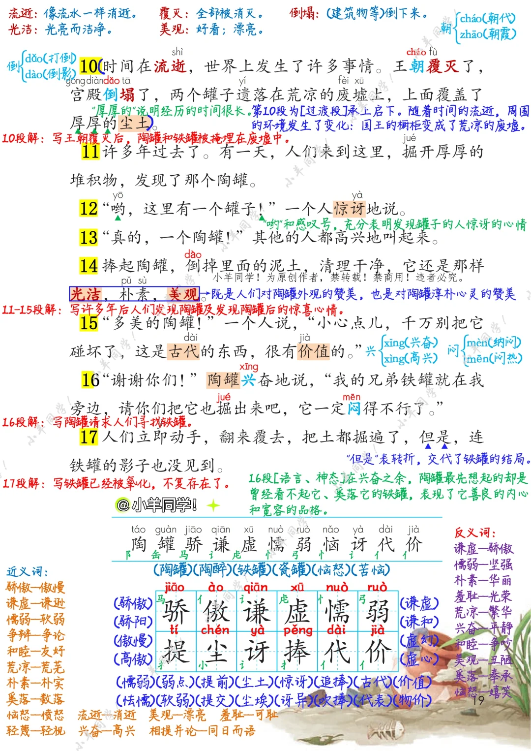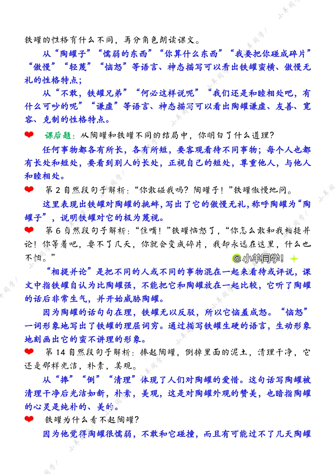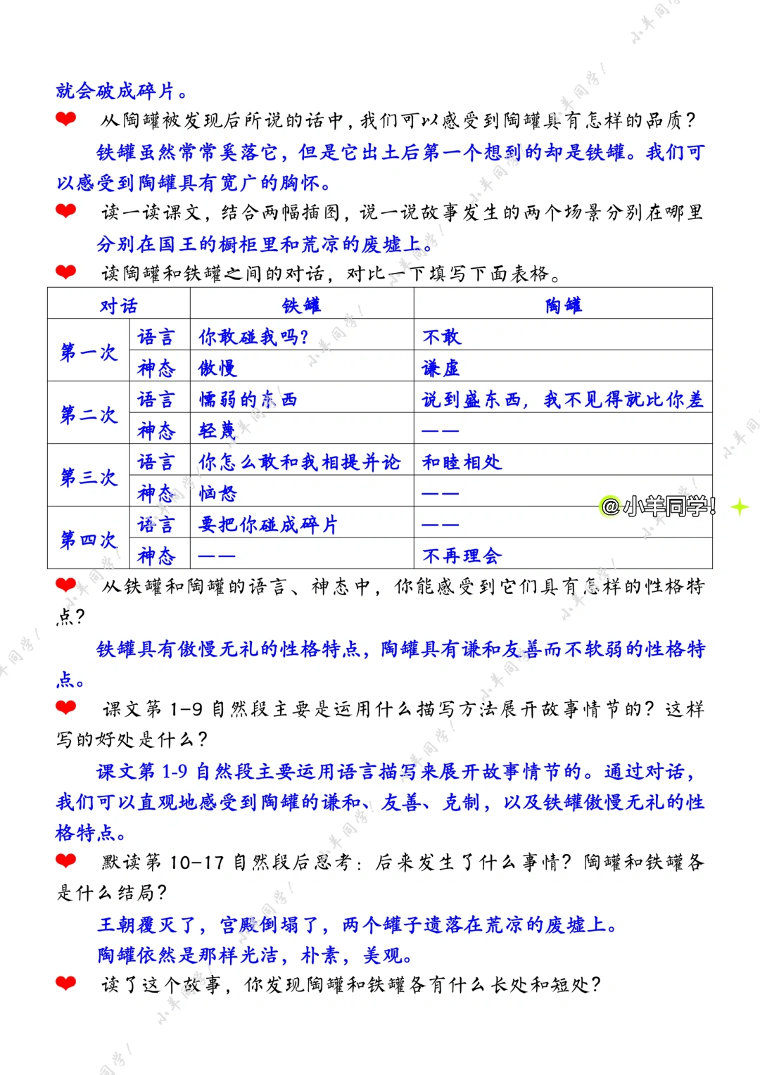 🌻学习目标: 1️⃣:认识“陶、罐”等11个生字,会写“骄、傲”等12个字,会写“国王、骄傲”等词语。 2️⃣:结合课文相关词句,了解陶罐和铁罐不同的性格特点。分角色朗读课文。 3️⃣:默读课文,能说出陶罐和铁罐之间发生的故事,懂得每个人都有长处和短处,学习正确看待人和事物。 4️⃣:能说出“阅读链接”中的北风和课文中的铁罐的相似之处。