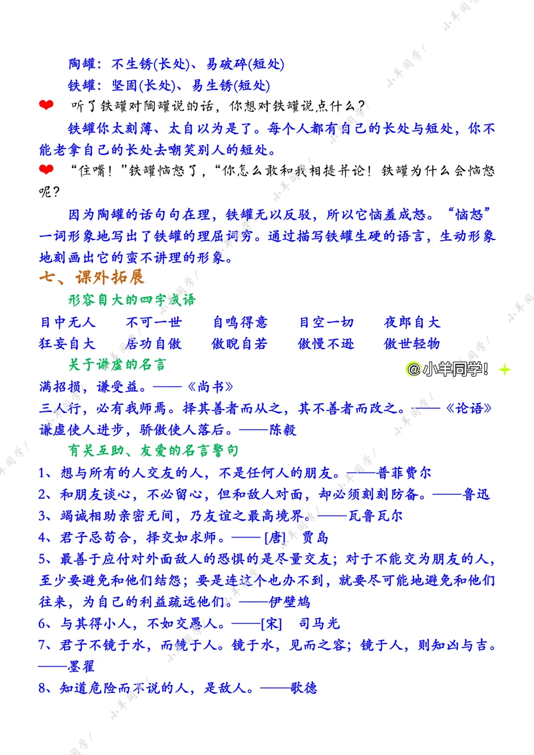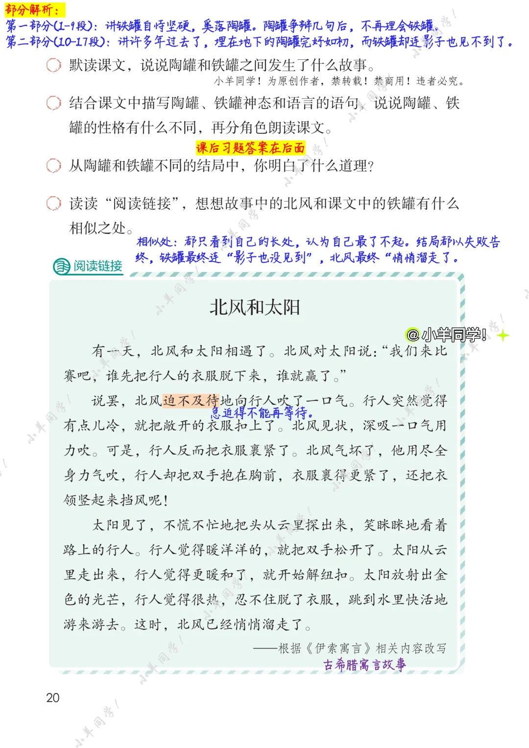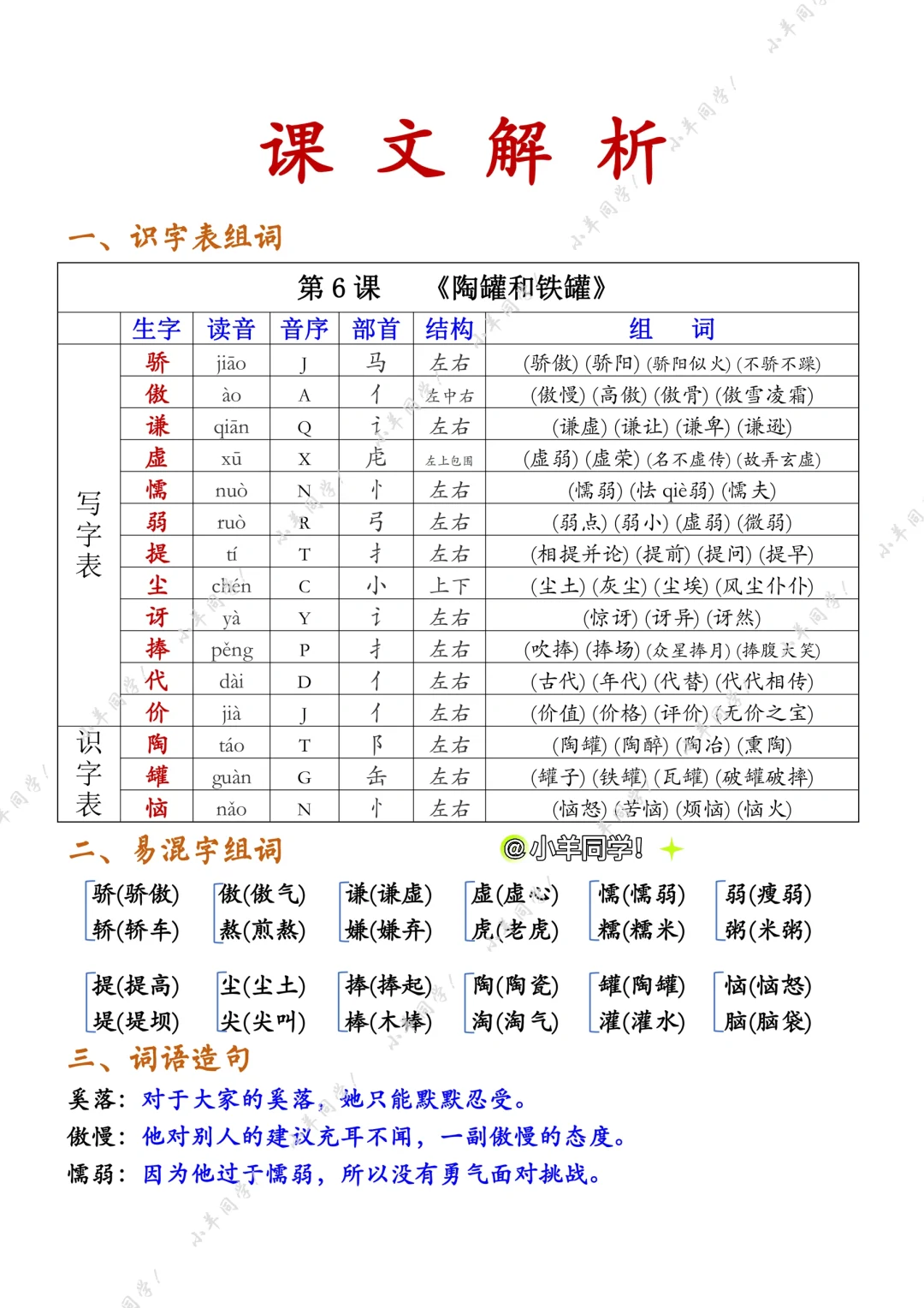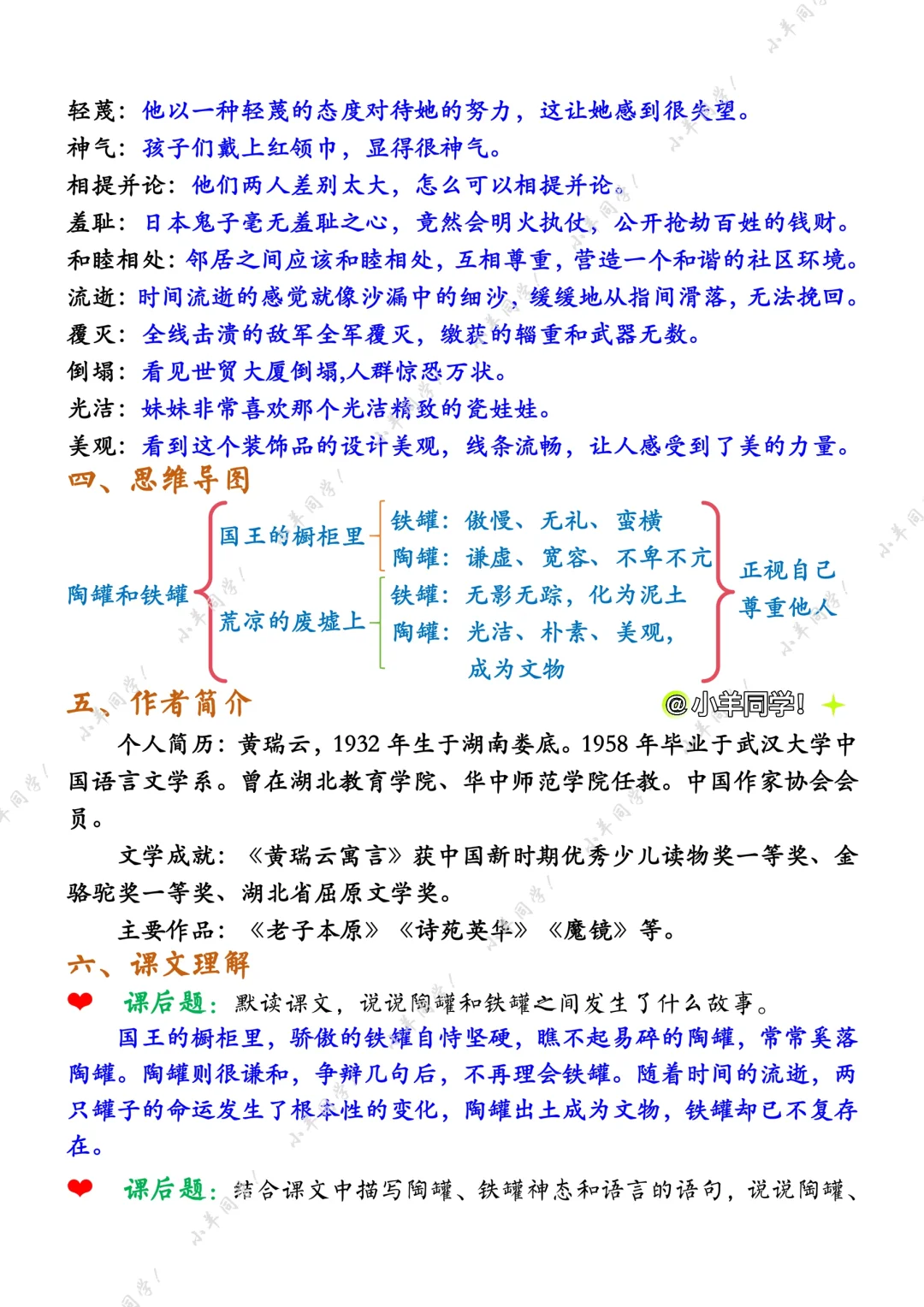 🌻学习目标: 1️⃣:认识“陶、罐”等11个生字,会写“骄、傲”等12个字,会写“国王、骄傲”等词语。 2️⃣:结合课文相关词句,了解陶罐和铁罐不同的性格特点。分角色朗读课文。 3️⃣:默读课文,能说出陶罐和铁罐之间发生的故事,懂得每个人都有长处和短处,学习正确看待人和事物。 4️⃣:能说出“阅读链接”中的北风和课文中的铁罐的相似之处。
