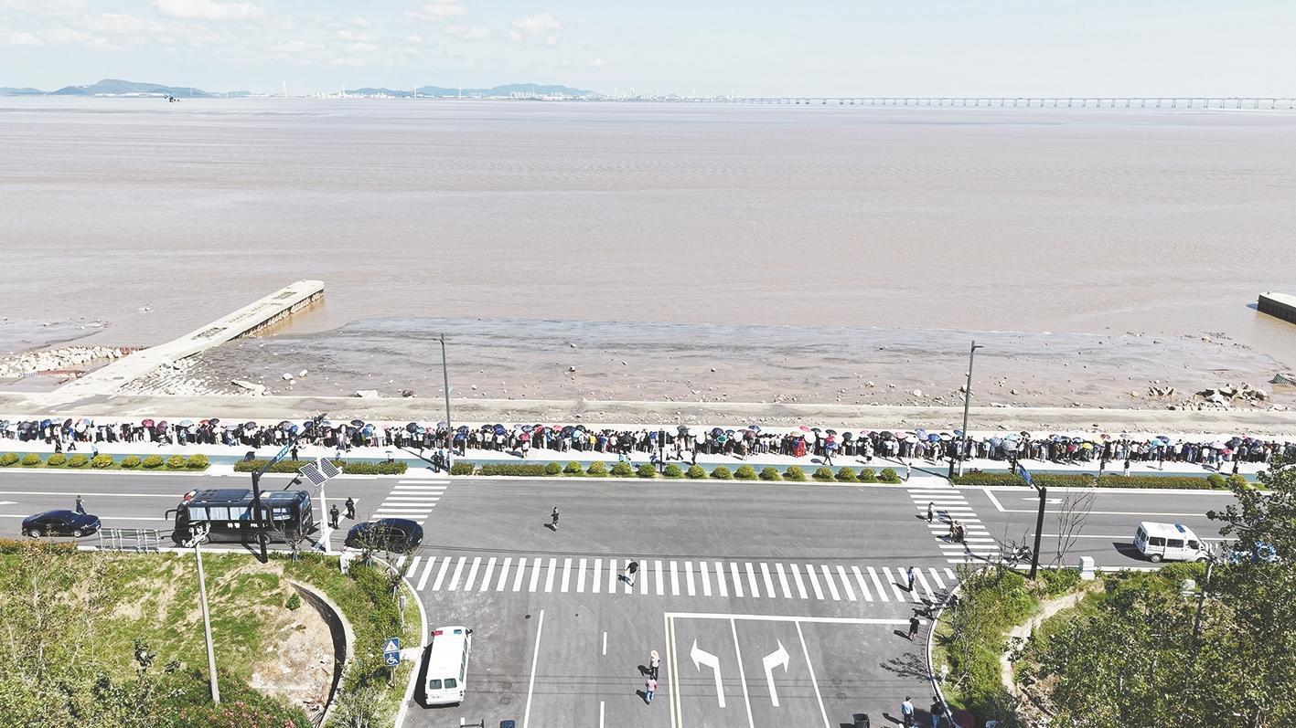 昨天,有五六千人来到柯桥区马鞍街道临江一线海塘大堤观潮