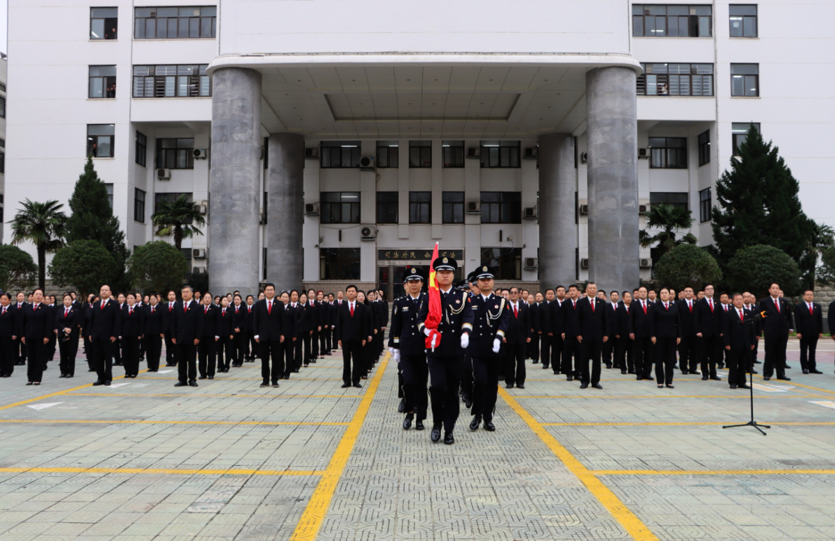 上午9时,干警们身着制服、精神饱满、整装肃立。由法警组成的国旗护卫队迈着铿锵有力的步伐,护送五星红旗走向升旗台。在嘹亮的国歌声中,鲜艳的五星红旗冉冉升起,迎风飘扬。全体干警怀着崇敬之情迎着国旗行注目礼,表达对祖国和人民的忠诚和热爱,展现了锐意进取、奋发有为的精神风貌。