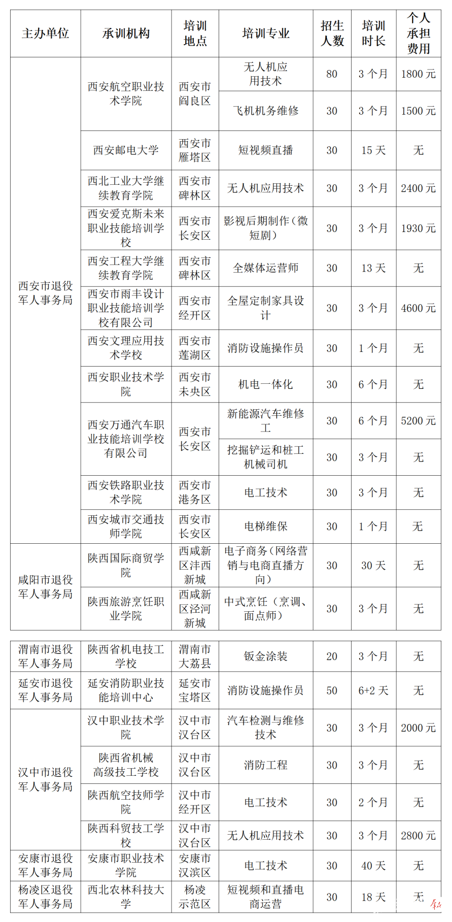 本次技能培训在西安、咸阳等7市(区)21个学校(机构)开办无人机应用技术、短视频直播、新能源汽车维修工等23个专业培训班。其中,15个为免费培训项目,其余8个培训项目因收费超出补助标准,需个人承担部分费用。参加以上培训期间包住宿,享受免费伙食或生活补助,往返交通费自理。