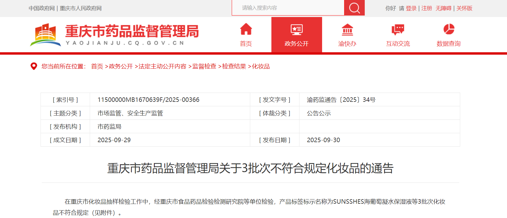 在重庆市化妆品抽样检验工作中,经重庆市食品药品检验检测研究院等单位检验,产品标签标示名称为SUNSSHES海葡萄凝水保湿液等3批次化妆品不符合规定(见附件)。