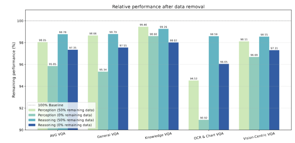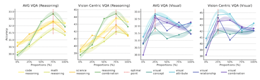 基于以上发现,研究团队的目标从「解释现象」转向了「主动创造」。他们通过系统的实验,最终调配出了一套最优的数据混合方案,旨在平衡模型的语言能力和视觉潜力。
