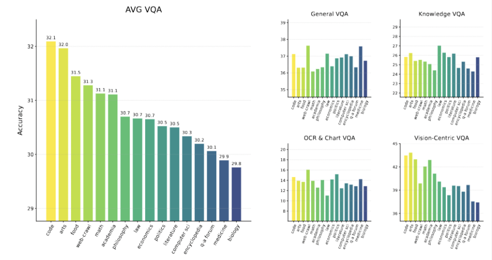 能力的起源有迹可循:通过对16种不同单一数据源的独立训练,研究发现,在「代码」「数学」和「学术」数据上训练的模型,在需要抽象推理的视觉任务(Vision-CentricVQA)上表现最好。