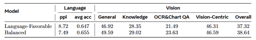 实验结果表明,通过采用这种富含推理内容、同时配有适量视觉世界知识的「平衡配方」(Balancedmodel),训练出的7B模型在语言能力上与专门优化语言任务的预训配方训练的模型达到了更优,同时在所有视觉基准测试中都实现了全面超越。