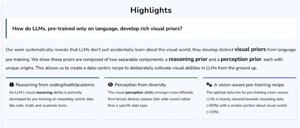 简单来说,想要让一个LLM拥有强大的视觉潜力,关键不是给它读无数遍「天空是蓝色的」,而是让它通过解数学题、读代码来把「脑子」练聪明。