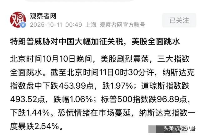 特朗普对中国抡起百倍关税大棒,美国自己先疼得跳脚! 美国总统特朗普10月11日突然宣布,从11月1日起对所有中国商品加征100%关税。他声称这是针对中国稀土出口管制的反击,但华尔街瞬间崩盘。纳斯达克指数狂跌820点,标普500创下半年最大跌幅。中概股血流成河,阿里巴巴暴跌超8%。 更讽刺的是,同一时间美国国内矛盾爆发。特朗普政府计划在爱达荷州空军基地为卡塔尔建造训练设施,并允许其F-15战机分队驻扎。美国民众彻底炸锅,白宫社交平台被刷屏质问“为什么让外国军队驻留本土”。 关税政策还没正式落地,美国西海岸港口已一片萧条。洛杉矶港和长滩港的来自中国货船一度清零。消费者很快要面对涨价,音响设备半年涨了14%,家具企业已开始提价。 而卡塔尔角色十分微妙。它刚被特朗普用一纸行政令承诺“受到攻击等同于威胁美国”,转头又成美委冲突的调解人。哥伦比亚总统公开请求卡塔尔劝美国停手在加勒比海的军事行动。 参考资料:观察者网、网易、腾讯新闻等综合报道