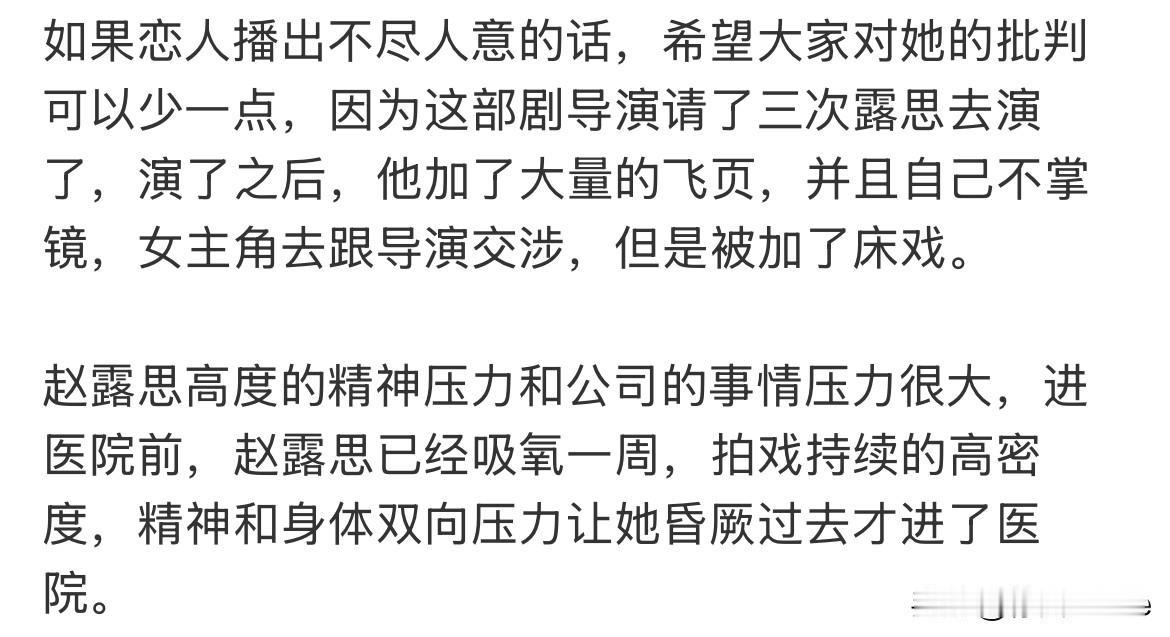 10月11日,赵露思控诉《恋人》导演邓科! 为了让她拍这部剧,请了她三次,她进组了,邓科就变了,不光擅自加床戏,还不掌镜,又加了大量的飞页,也就是原剧本中没有的剧情内容,剧组跟公司的压力导致她生病! 难怪赵露思如此讨厌这部剧,恨不得它播不出,所有跟这部剧相关的人都赔钱,难怪赵露思得知这部剧能播后如此生气,这部剧的拍摄体验是真的差,赵露思可能都不愿意回想,邓科挂羊头卖狗肉……