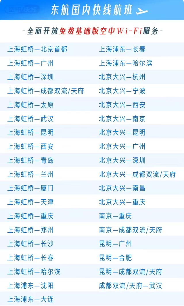2025年10月11日起,中国东方航空再次对“空中快线”Wi-Fi服务进行重磅升级:所有宽体机执行的国内“空中快线”航班提供经济舱全舱位免费版Wi-Fi服务,满足旅客“用网免费”与“连网便捷”的需求。