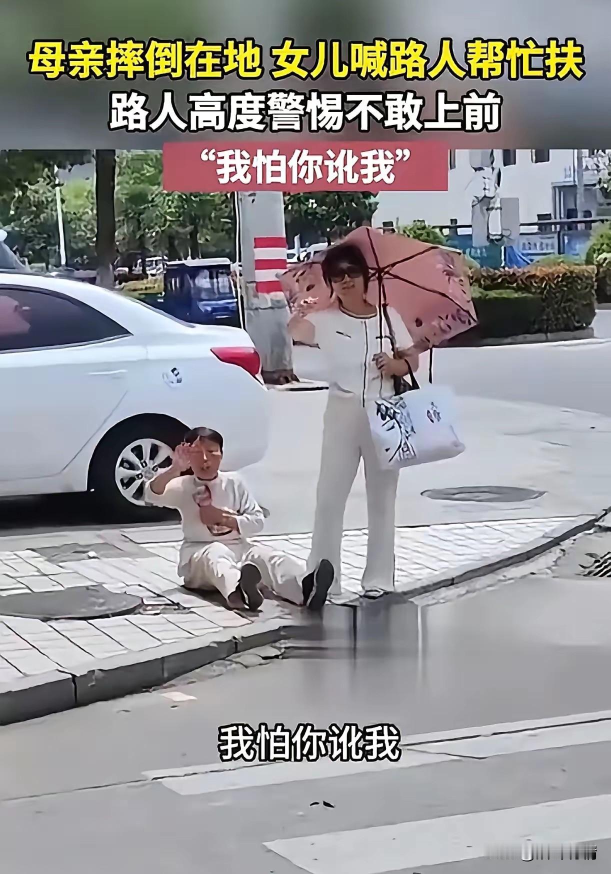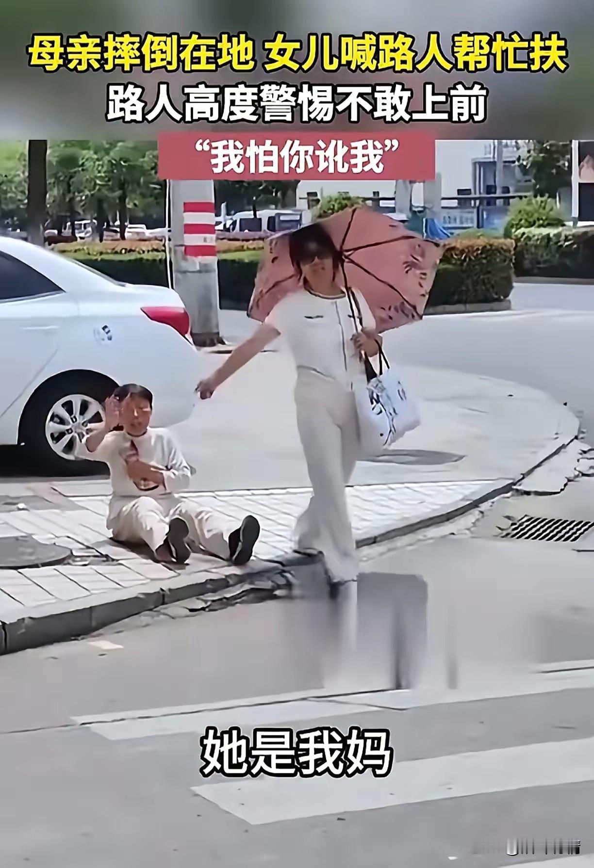 母亲过马路摔倒了, 女儿单手搀扶母亲没有成功, 看到路人大声招呼, 母亲也努力挥手微笑, 展示自己非常和善, 帮个忙老人摔倒了扶一下? 路人看到两人也是非常害怕, 不敢上前直言你讹我怎么办? 女子赶紧解释这是我妈! 这句话直接吓坏路人, 你妈你自己都不扶, 让我扶这不是明摆讹人嘛? 一句我怕你讹我,我走了, 女人也真是一只手扶不起来, 就把手上的遮阳伞和包包放在地上, 把老妈扶起来再说, 你怕晒黑了,你老妈这么大年纪了, 坐地上你也不担心晒屁股, 都是些什么人呀! 咋看咋像讹人的局! 你们两个这样谁敢上前去扶, 不是现在的人冷漠了, 而是人心寒了什么政策也无效了! 大家对于老妈摔倒无人扶, 女子打遮阳伞向路人求助无果怎么看? 扶老人被讹 你支持维权赔偿吗 做好事扶老人被讹是谁之过 扶不扶摔倒老人 摔倒老人 扶老人 妈妈摔倒