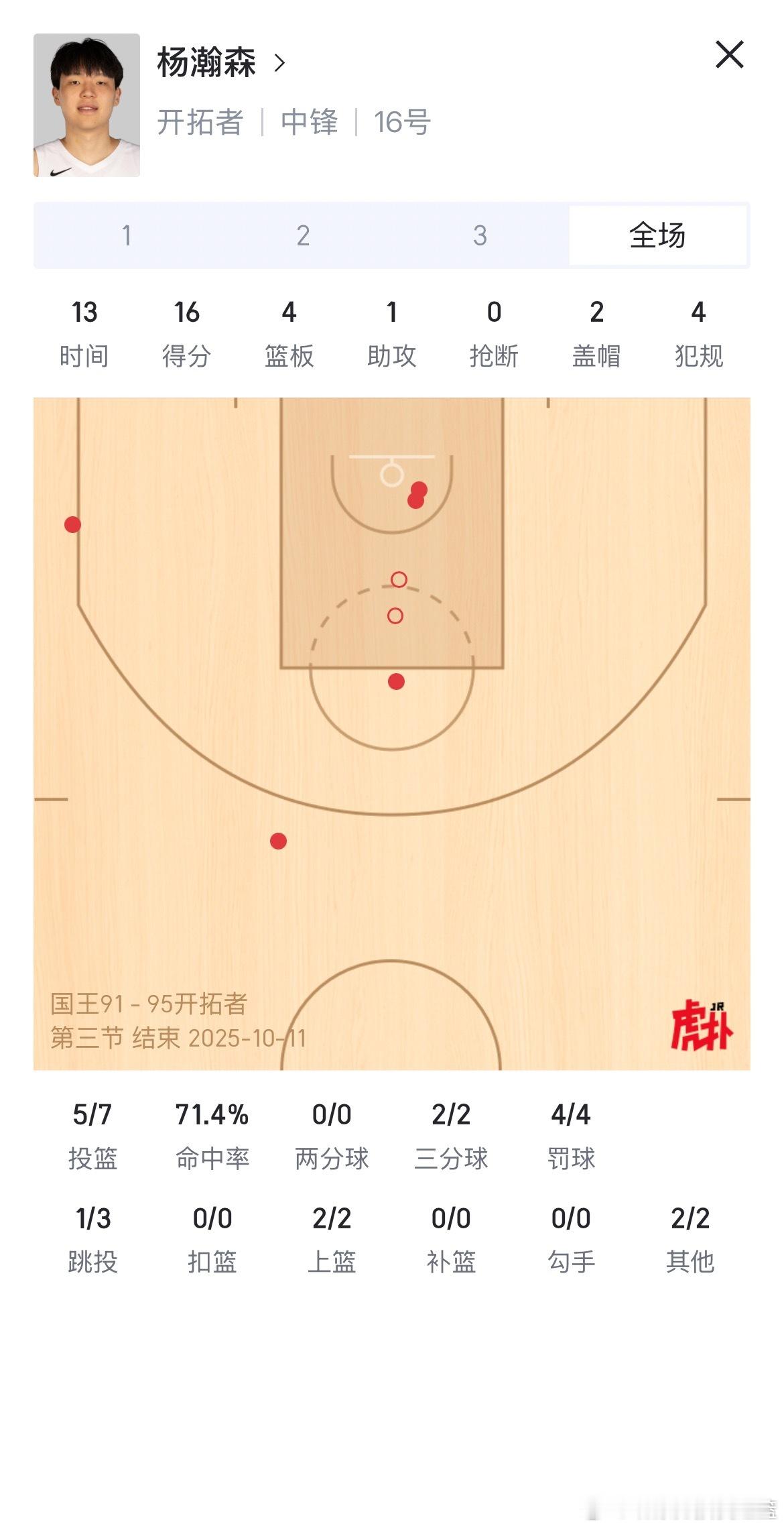 杨瀚森第三节比赛 投篮5中5 罚球2中2半节独得14分2篮板1助攻1盖帽[爱你]