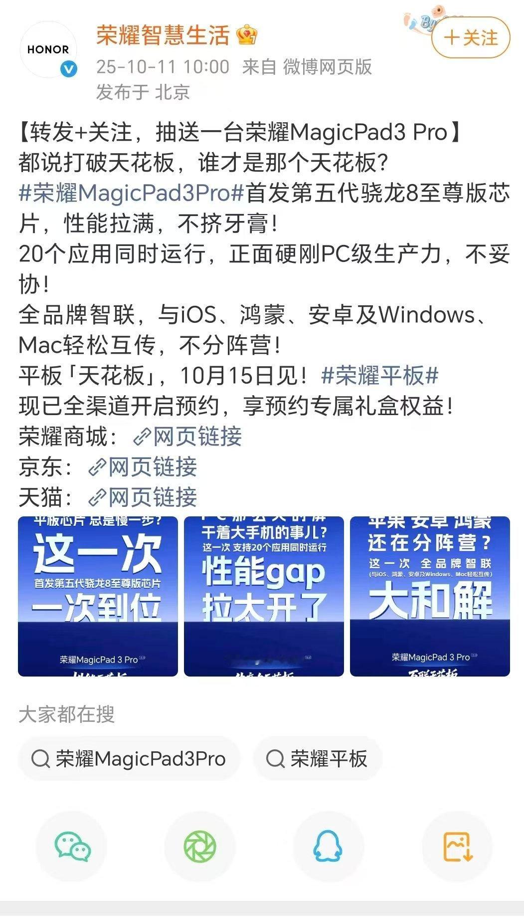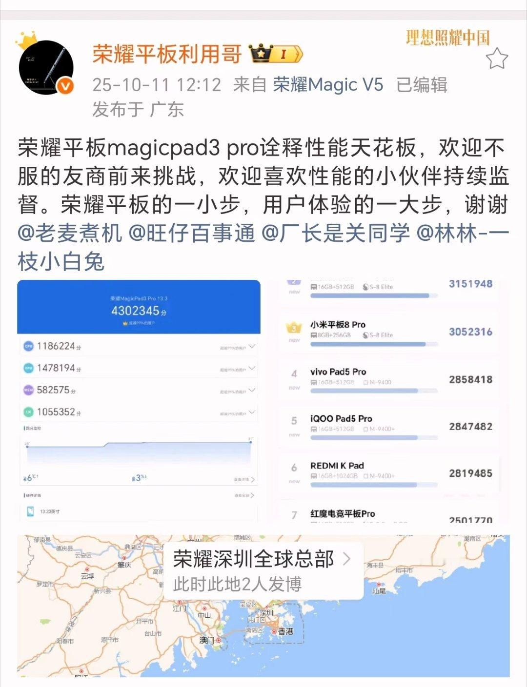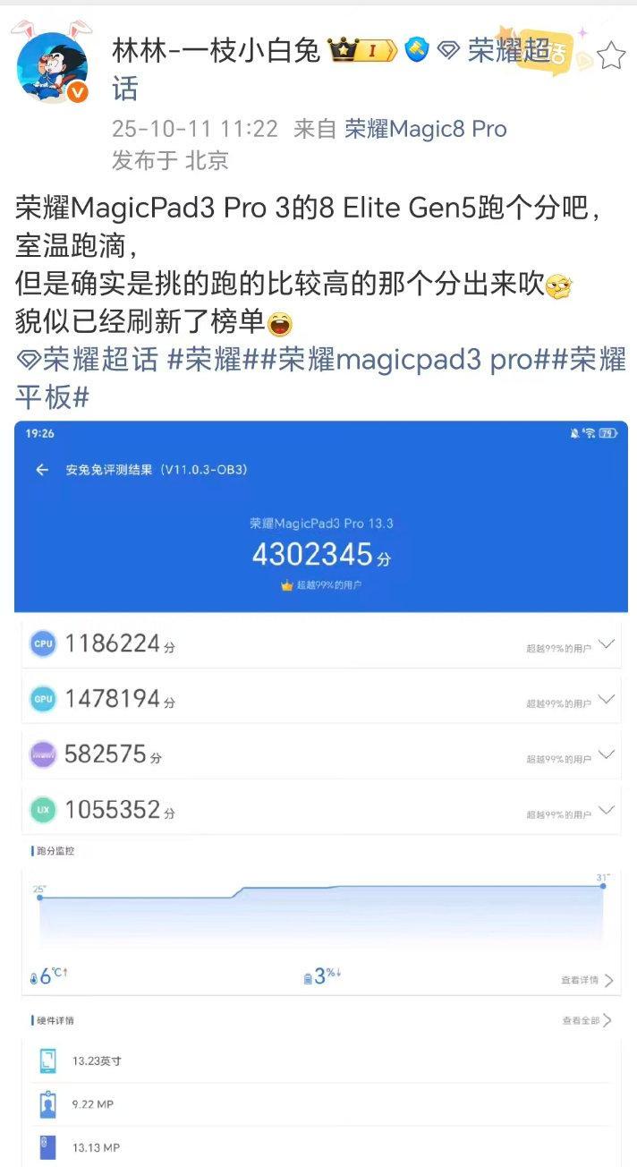 荣耀MagicPad3 Pro常温安兔兔跑分430万分!荣耀平板刷新历史跑分记录!!