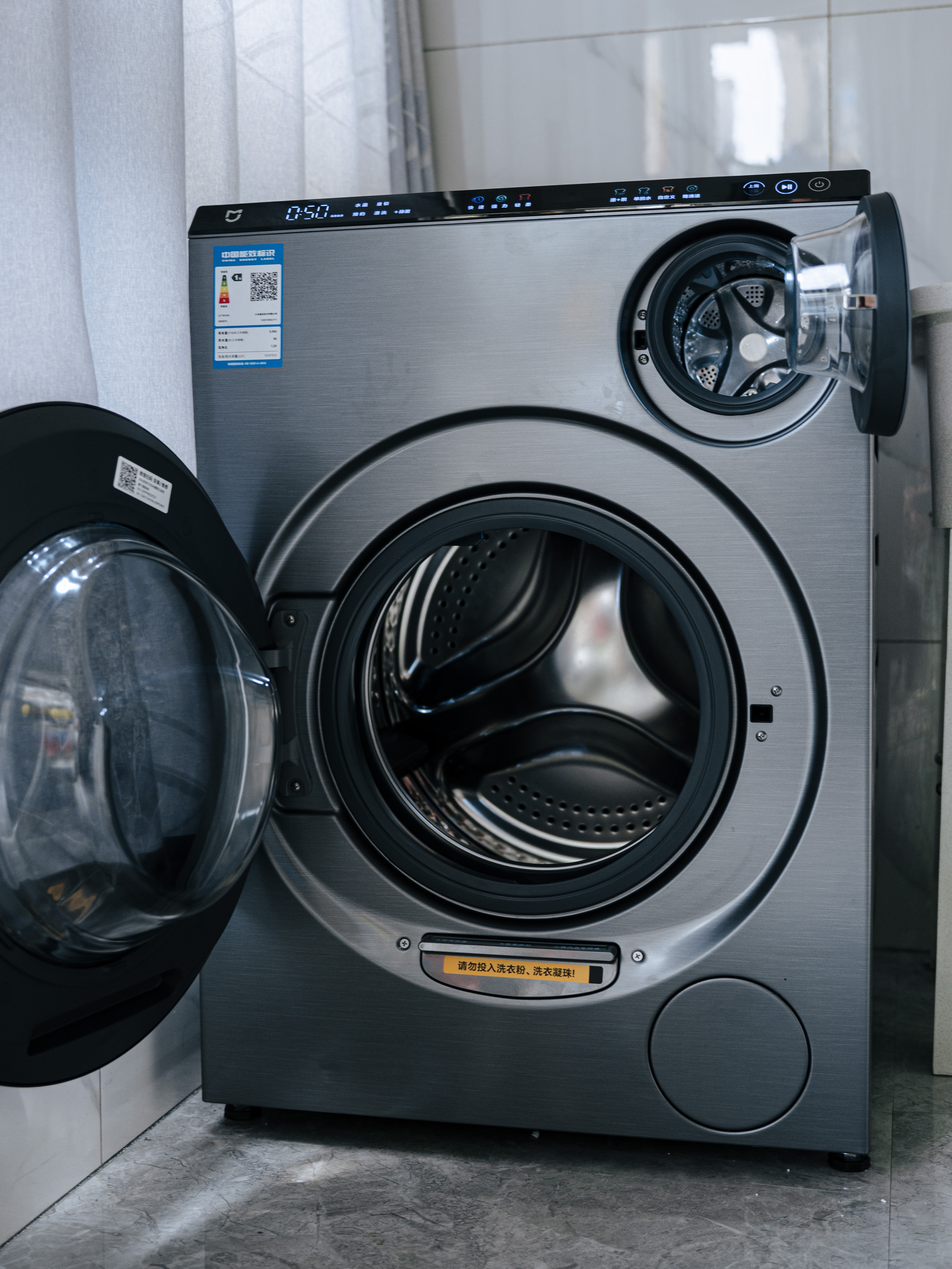 三路投放盒分别装大筒洗衣液、柔顺剂和小筒内衣专用液,一次加满能用一个月,不用每次倒洗衣液;赶时间时选 12 分钟快洗,省水 33%、省电 40%,给孩子洗换洗衣物,一杯牛奶的功夫就好。连忘取衣服的小马虎都被照顾到 —— 洗完 30 分钟没开门,它会自动抖散衣物、通新风,第二天取还是香香的,不会闷出异味。