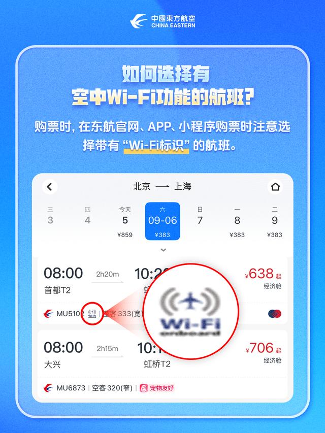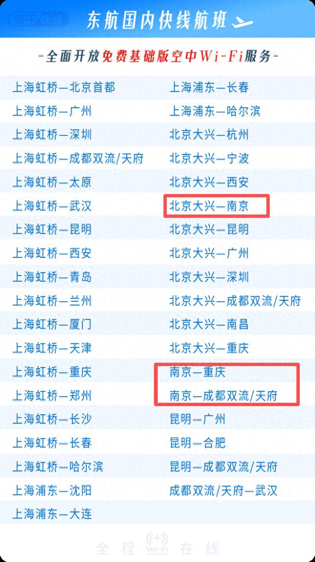 记者从中国东方航空了解到,从10月11日起,该航司所有宽体机执行的国内“空中快线”航班提供经济舱全舱位免费Wi-Fi服务,满足旅客空中用网免费、上网便捷的需求。