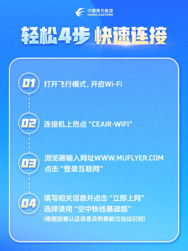 今后,无论乘坐国内“空中快线”宽体机头等舱、公务舱还是经济舱任一舱位,旅客都可全程免费使用Wi-Fi进行云端办公、购物或娱乐。如需更高速的网络体验,还可自愿升级至付费网络服务。